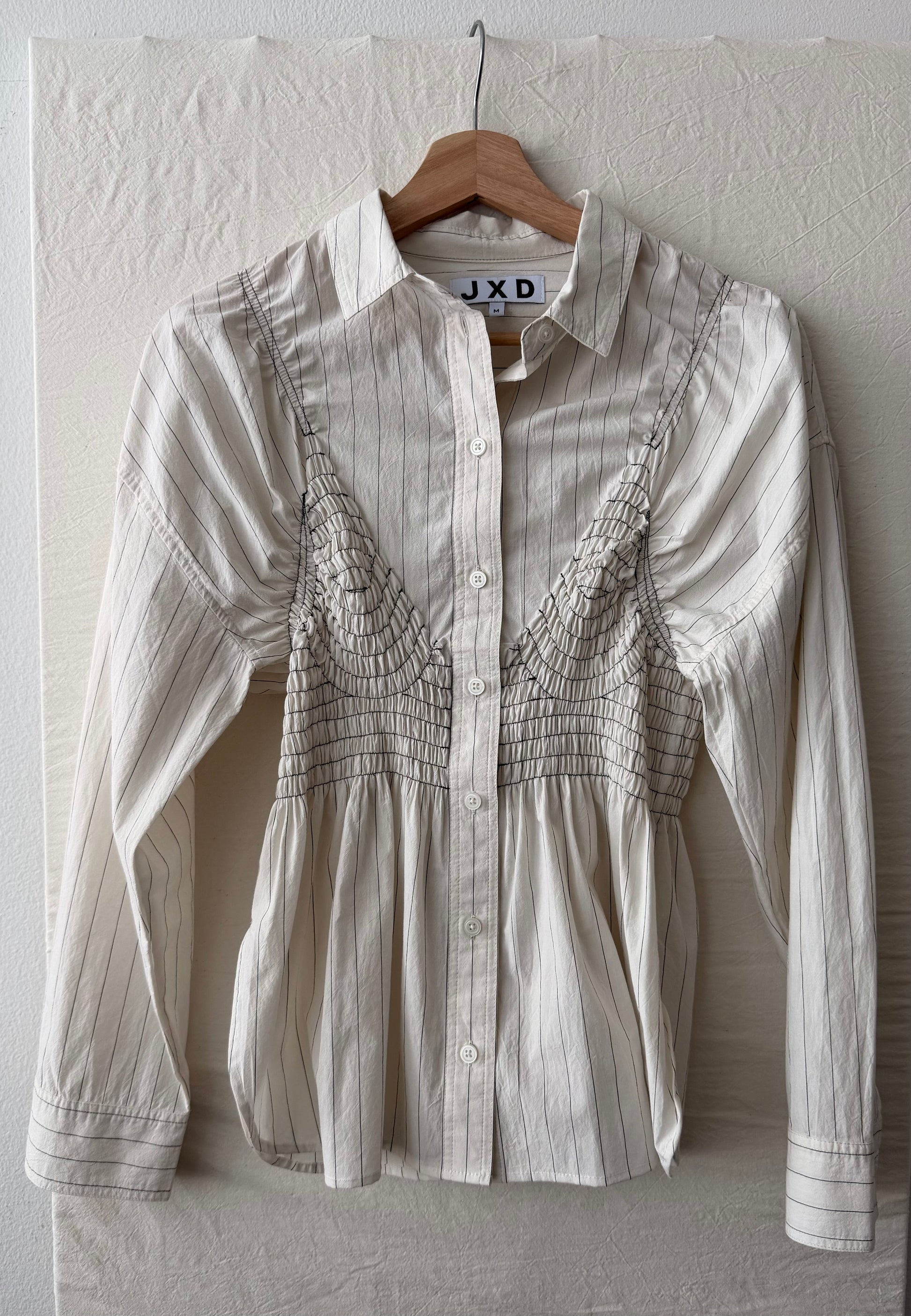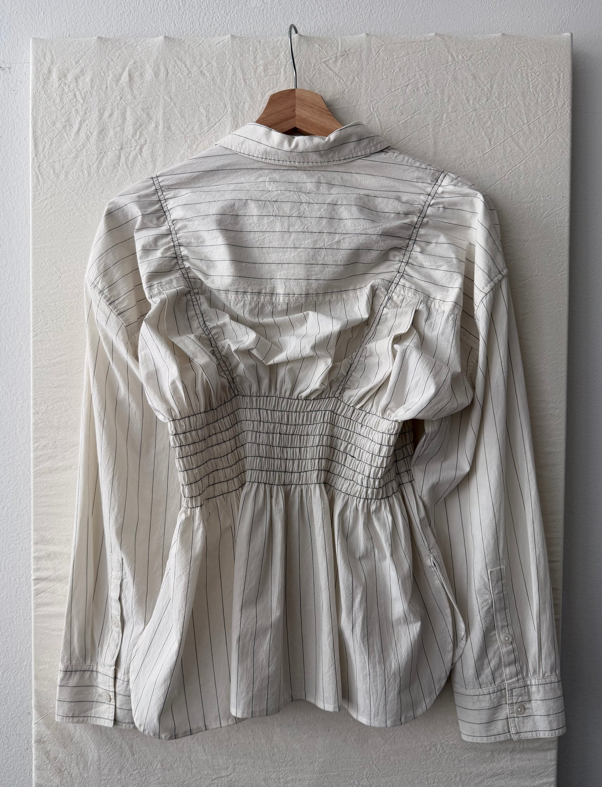 Reworked button up shirt with top stitching and elastic smocking to hug the waist. Made from a reclaimed shirt. A one-of-one—no two are alike, and each has its own specific fit.